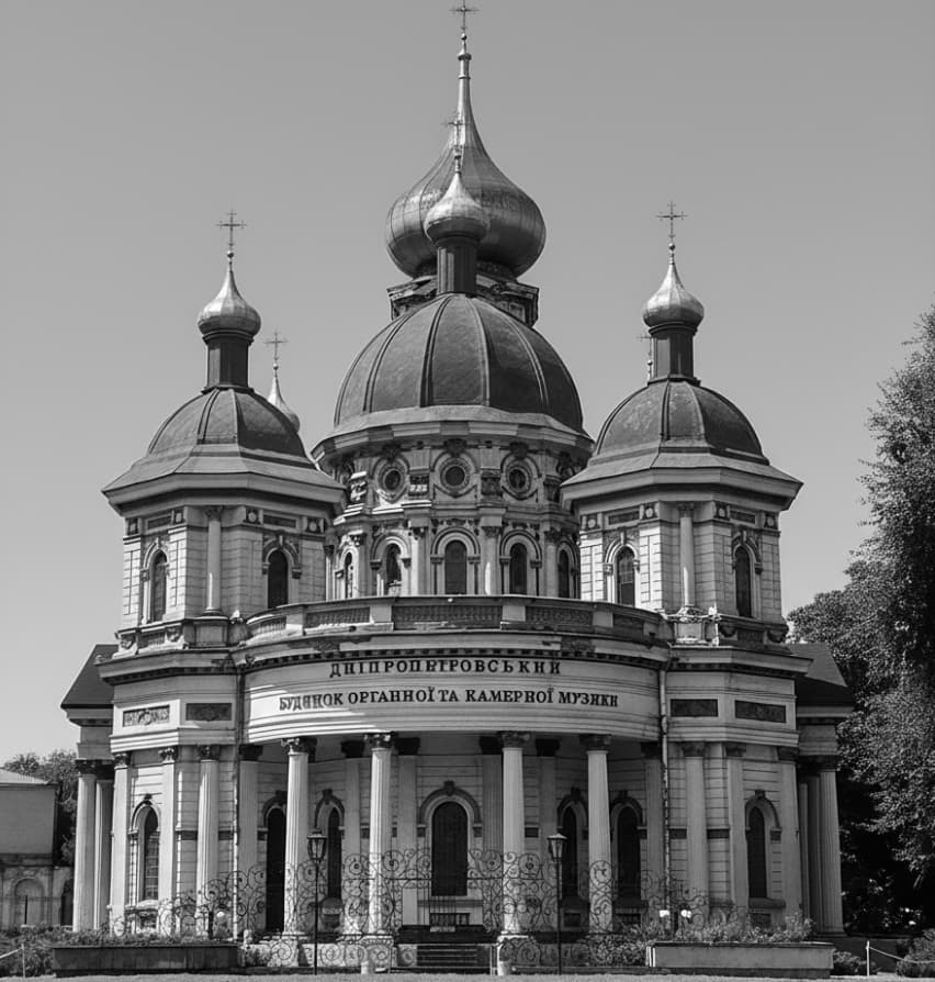 Designed in the Byzantine Revival style by diocesan architect Heorhii Turovets in the early 20th century. The brick, cross-shaped church features five domes, a semicircular apse, and a three-tier bell tower. In 1987, after reconstruction and installation of a German Sauer pipe organ, the building was transformed into the Dnipro House of Organ and Chamber Music.